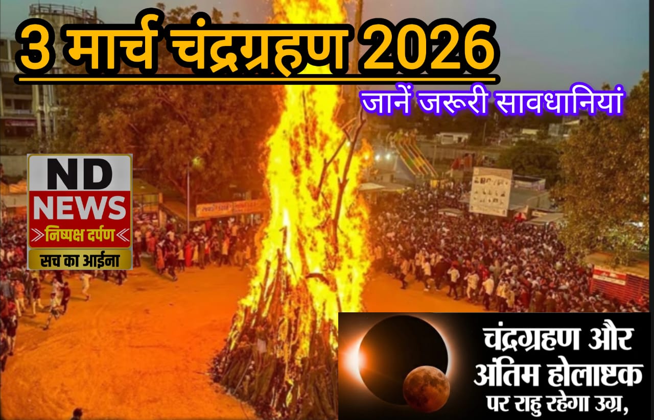 होलिका दहन और होलाष्टक के अंतिम दिन 3 मार्च 2026 का यह दिन ज्योतिषीय दृष्टि से अत्यंत महत्वपूर्ण माना गया है। ज्ञात हो कि वर्ष का पहला चंद्रग्रहण (Chandra Grahan) लगेगा। संयोग से होलिका दहन और होलाष्टक का 3 मार्च 2026 को सावधानियां बरतें…